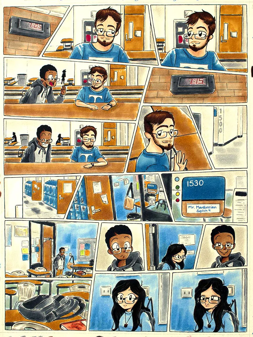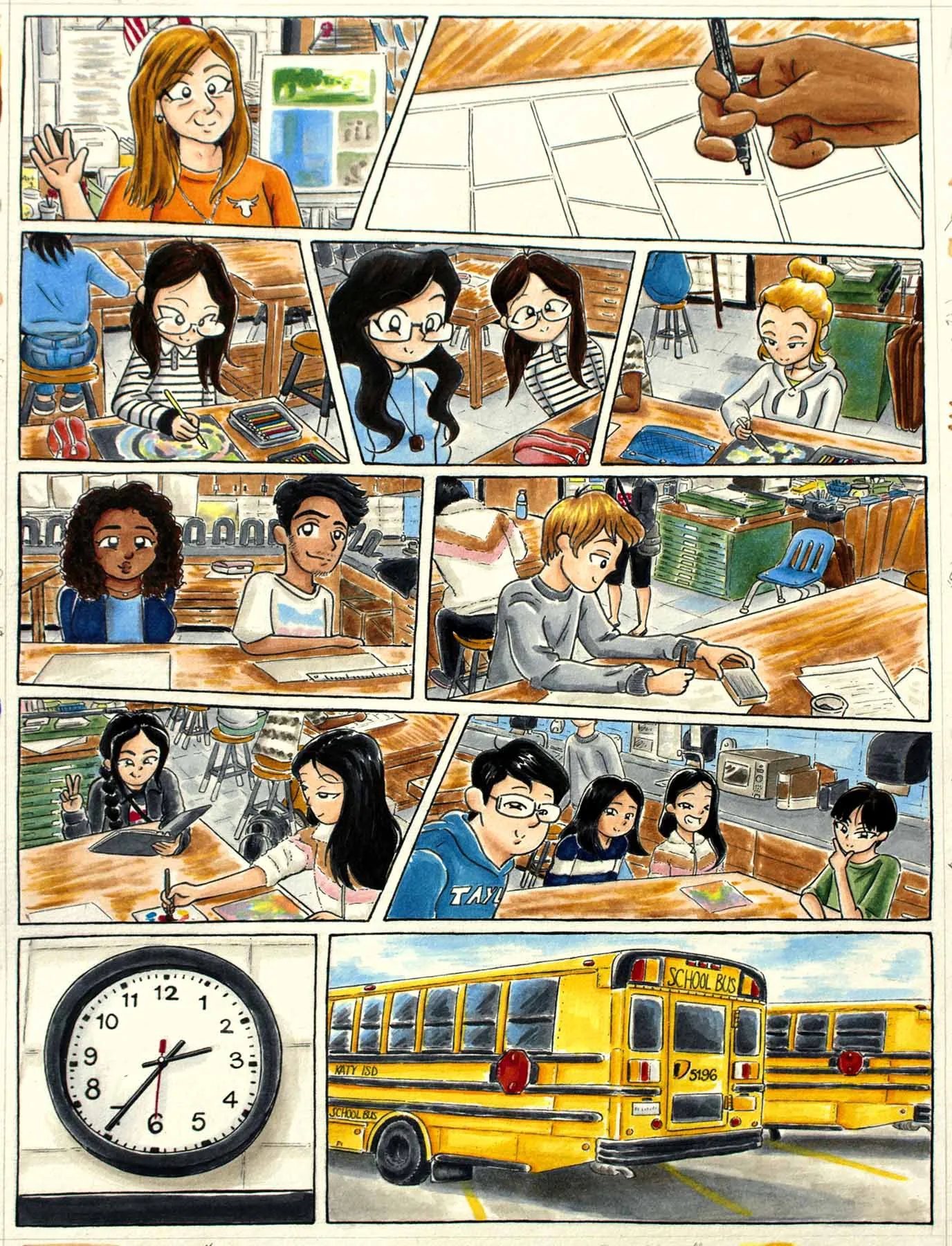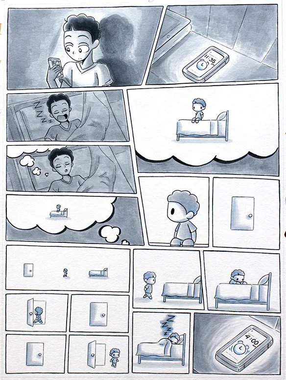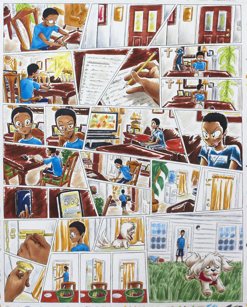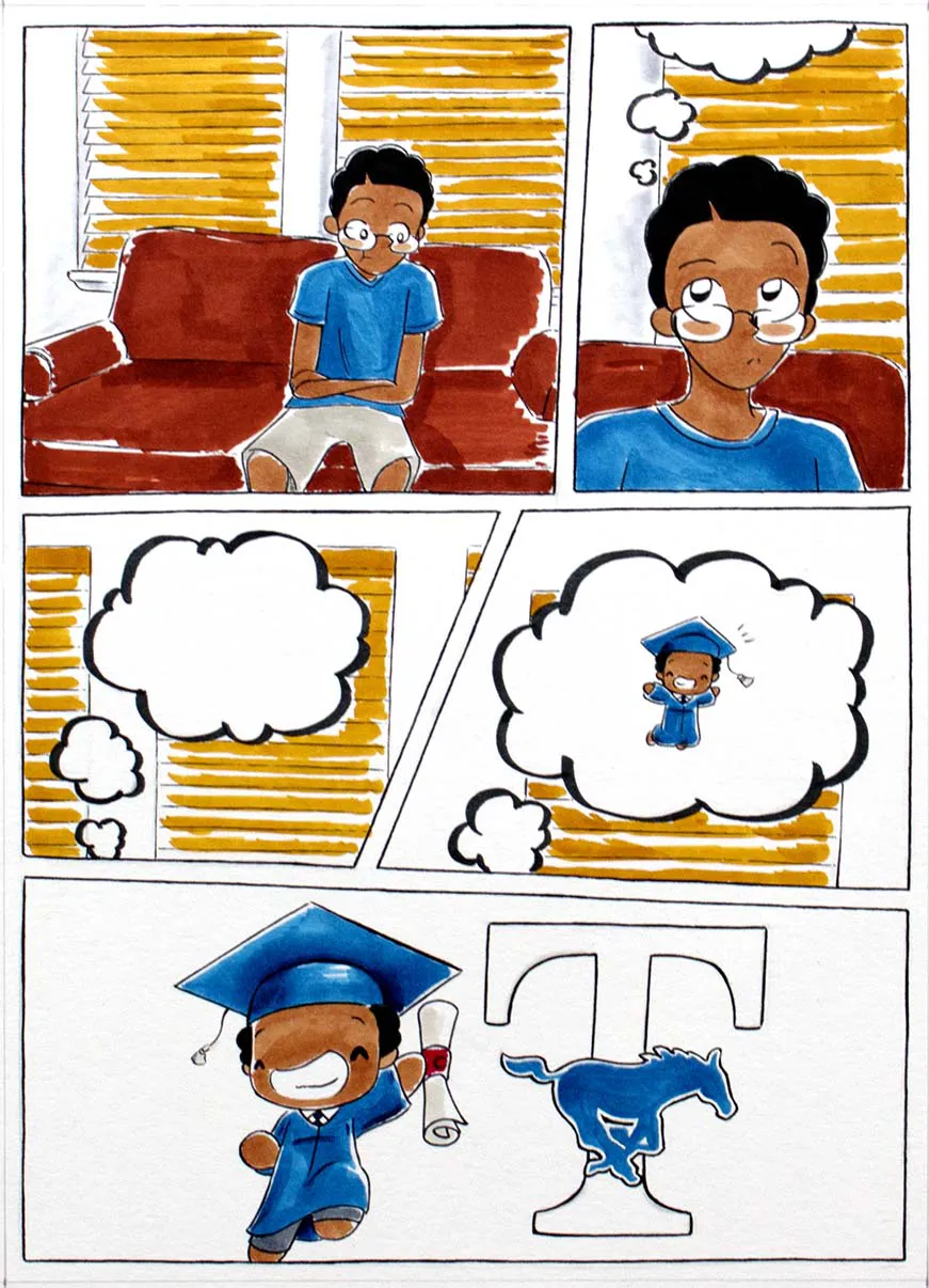 Each comic illustration features a particular moment of my day-to-day life while I was at home, doing homework, going to school, and then back home again. This range of work consist of the following mediums: black fine liner pens and copic markers.
