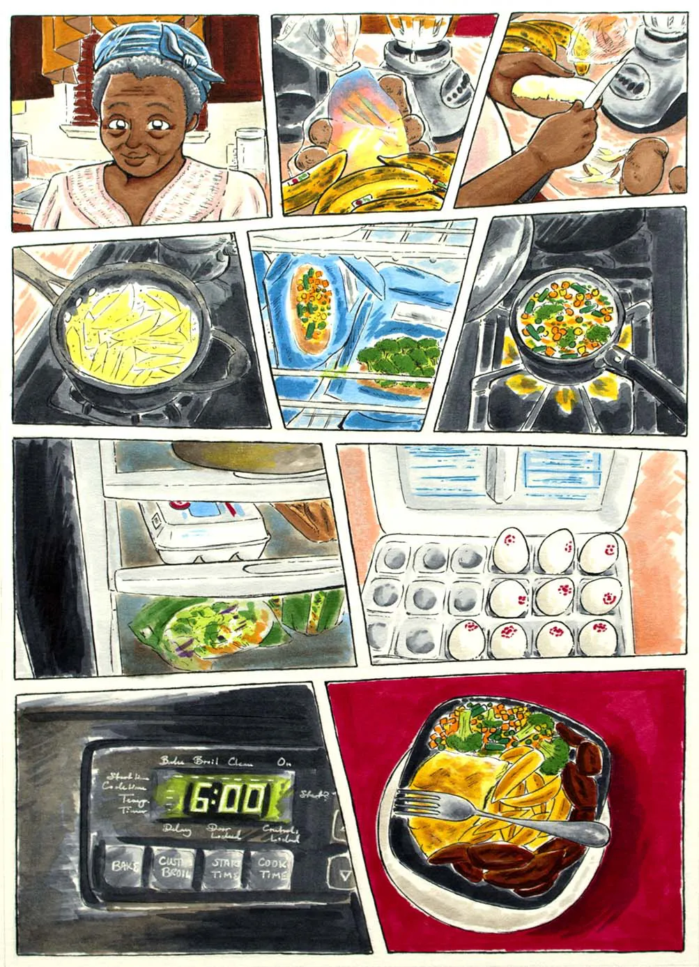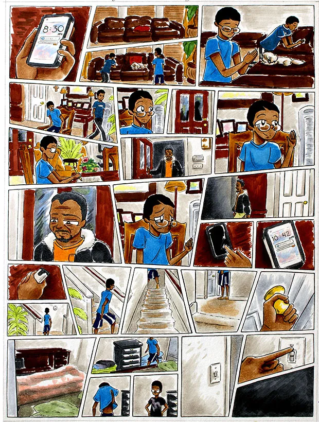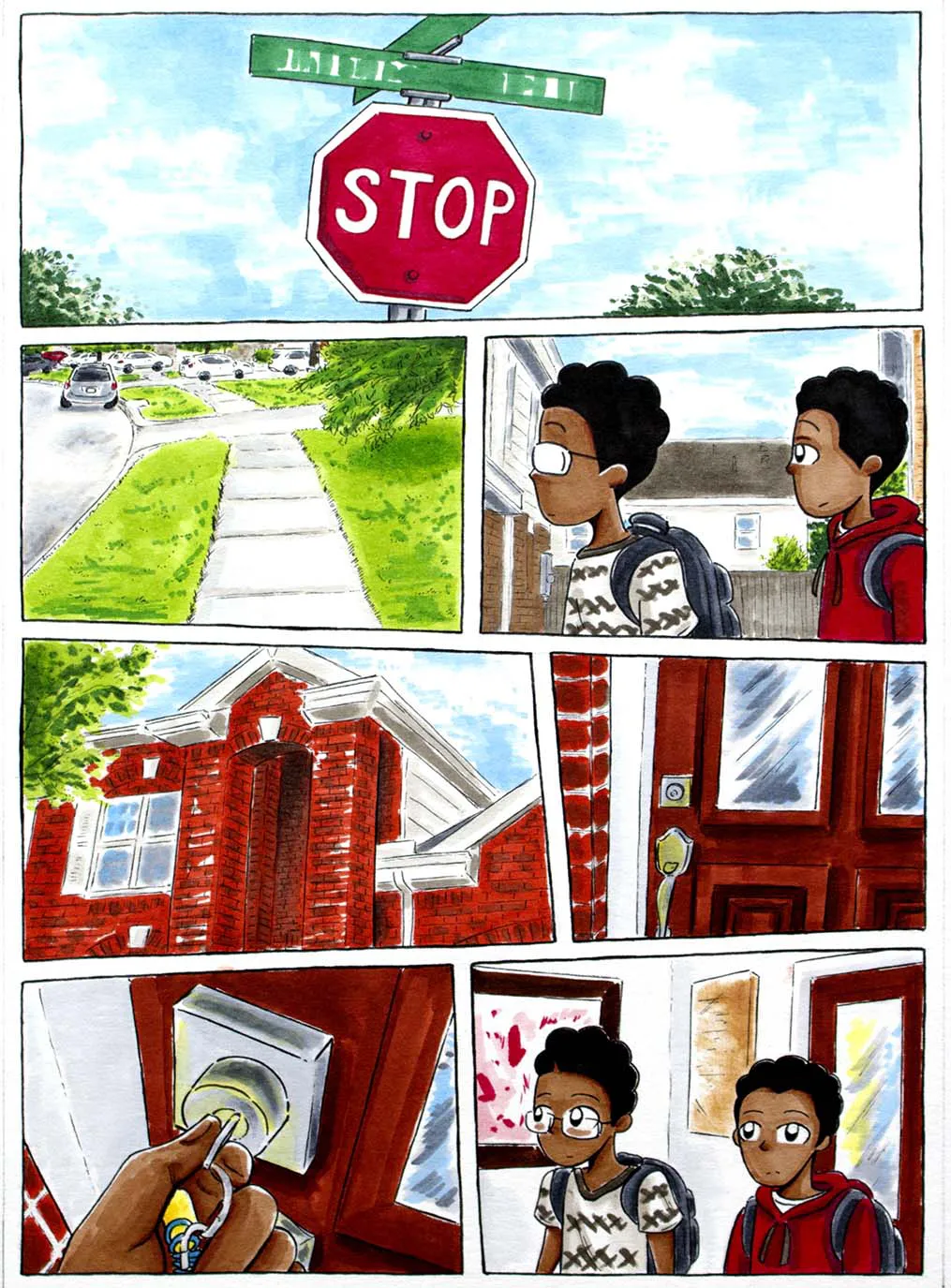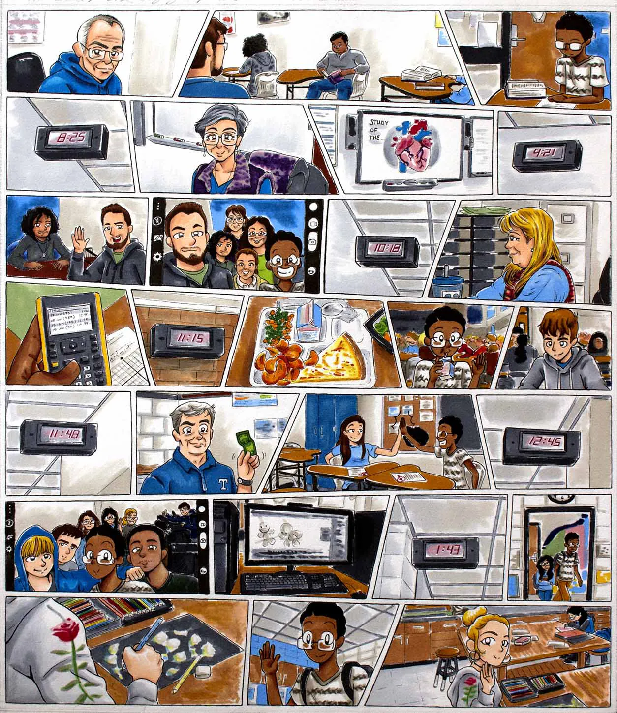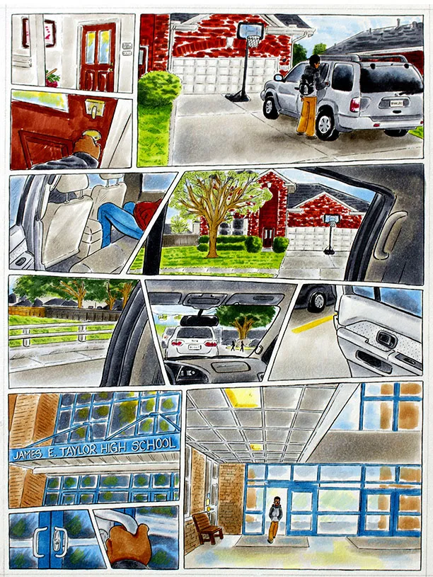 Each comic illustration features a particular moment of my day-to-day life while I was at home, doing homework, going to school, and then back home again. This range of work consist of the following mediums: black fine liner pens and copic markers.